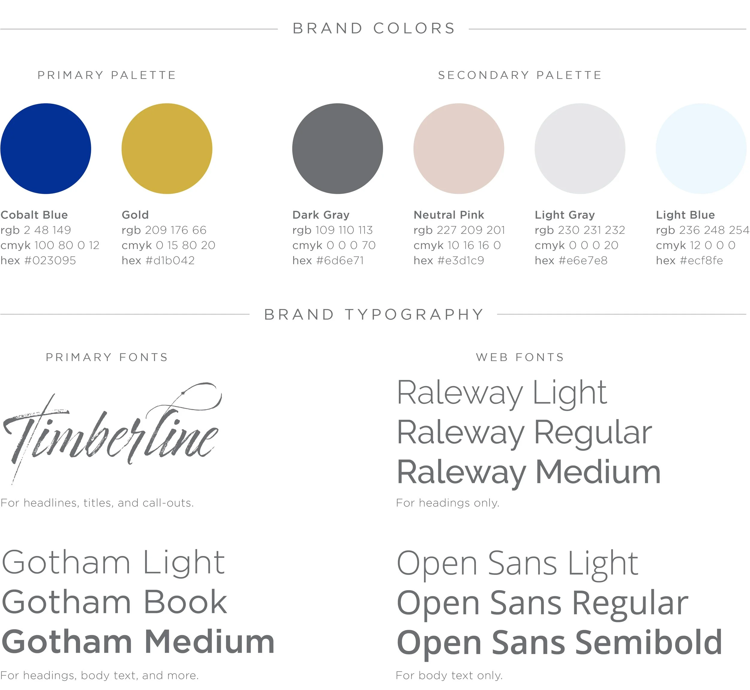 The palette includes cobalt blue and gold, accented with blush, gray, and cream tones. I selected fonts for both digital (web and mobile) and print usage to ensure elegance and legibility. Typography selections include: