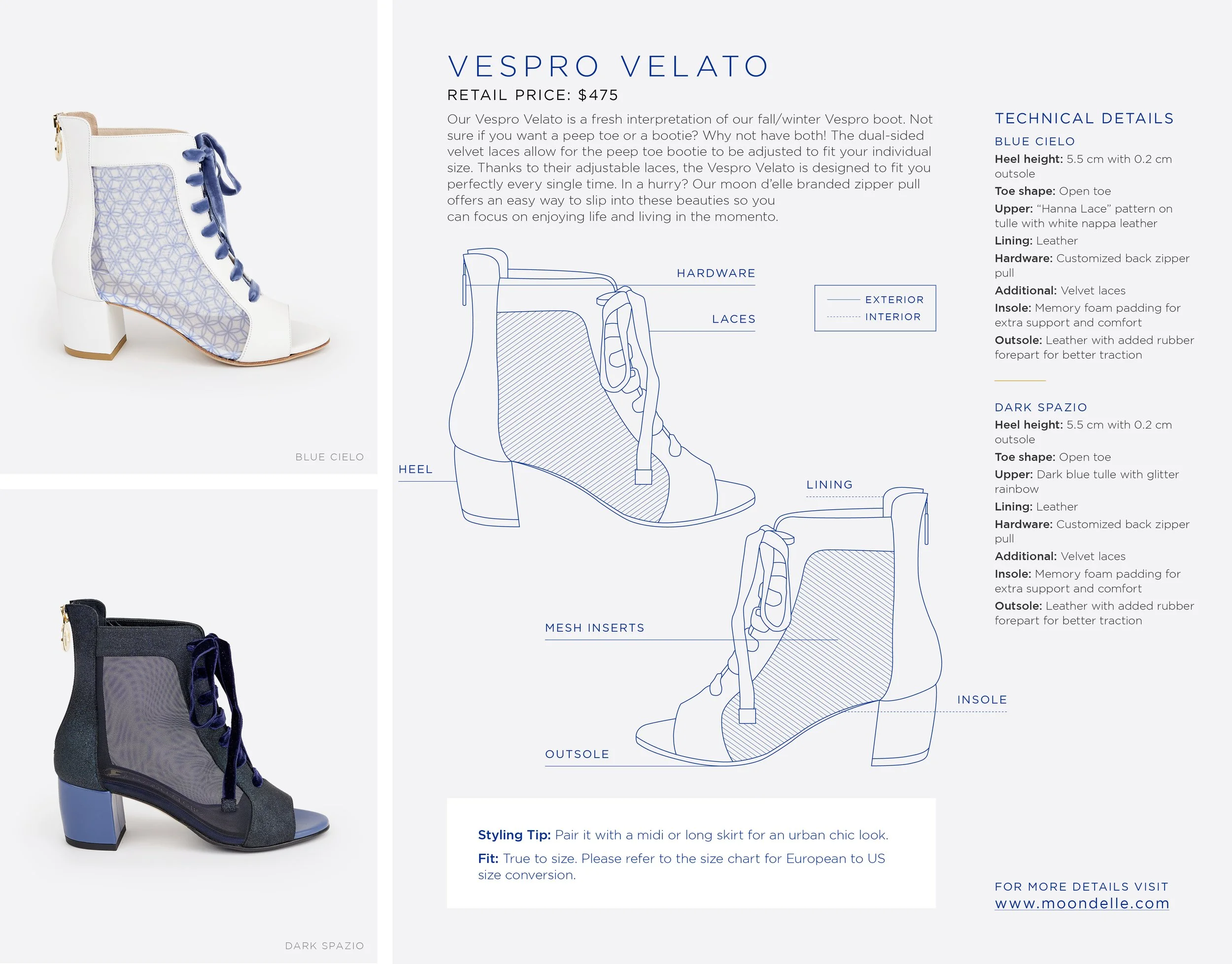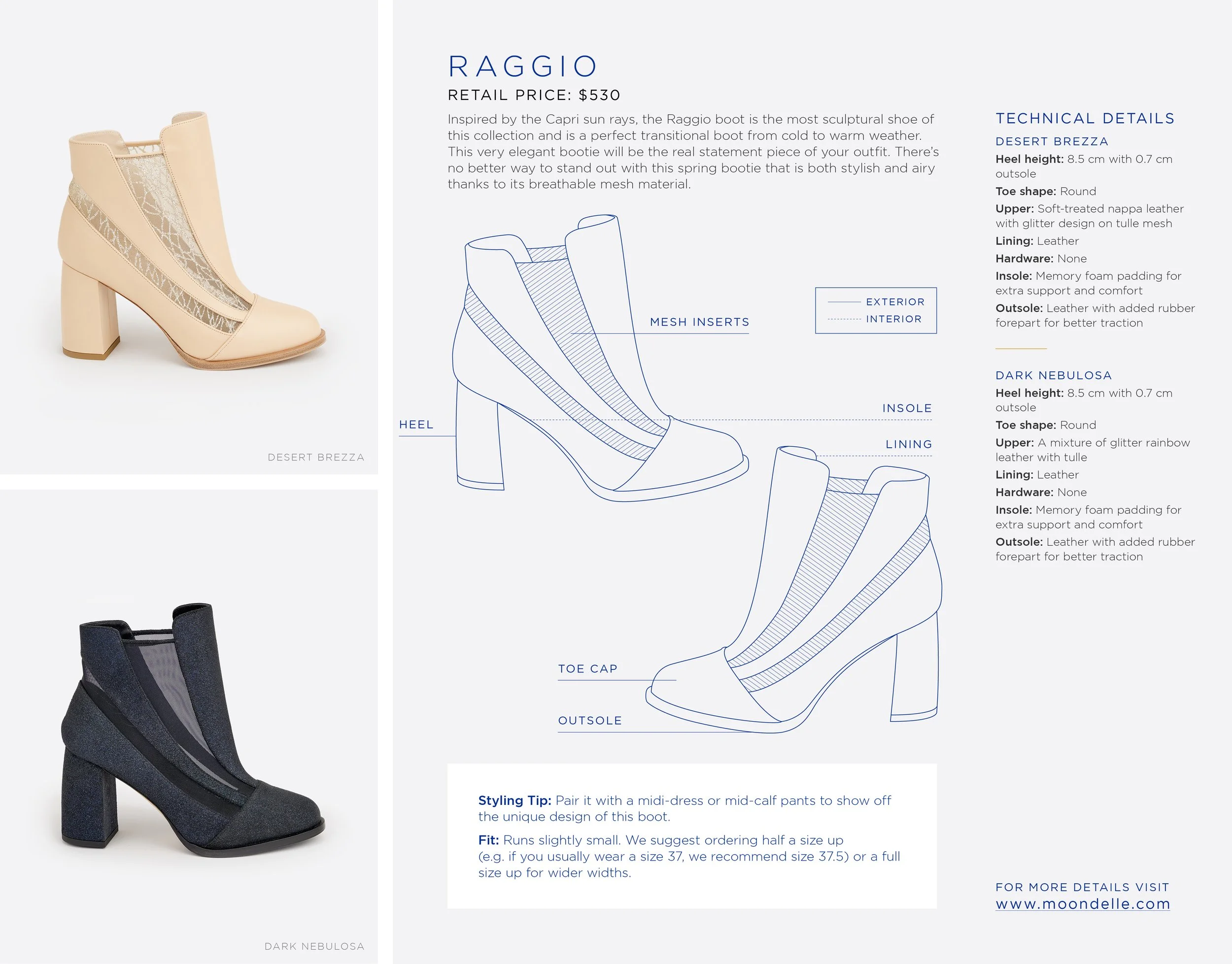 To help communicate the craftsmanship and design intent behind each product, I created detailed technical diagrams and illustrations that highlight the key features and construction of moon d’elle’s footwear. These visuals were used across the website and PR line sheets to educate customers, press, and retail partners about the materials, structure, and functional elements of each style. By translating complex product details into clear, visually engaging graphics, I supported both marketing and storytelling efforts while reinforcing brand credibility.