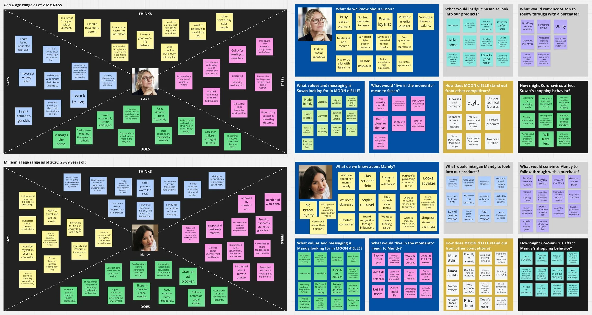 I led workshops, empathy mapping, and card sorting exercises to understand our target demographics. During COVID-19, I facilitated a team strategy session to re-evaluate personas and address shifts in consumer behavior. The Miro board snapshots below shows the persona mapping, behavioral insights, and card sorting outputs.